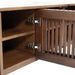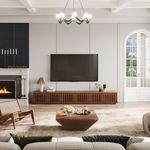 Gorgeous TV stand, mid century and sleek. Delivery and packaging was very thorough, fast and professional. I was a little intimidated by the crate but was able to disassemble it, lower it and remove the packaging myself at 5'4". I have a 75" Samsung TV and this is the 70" long console. I wish it had more holes for cords in the other sections in the back, this one only has two in the center section. I'm very pleased with the look of it.